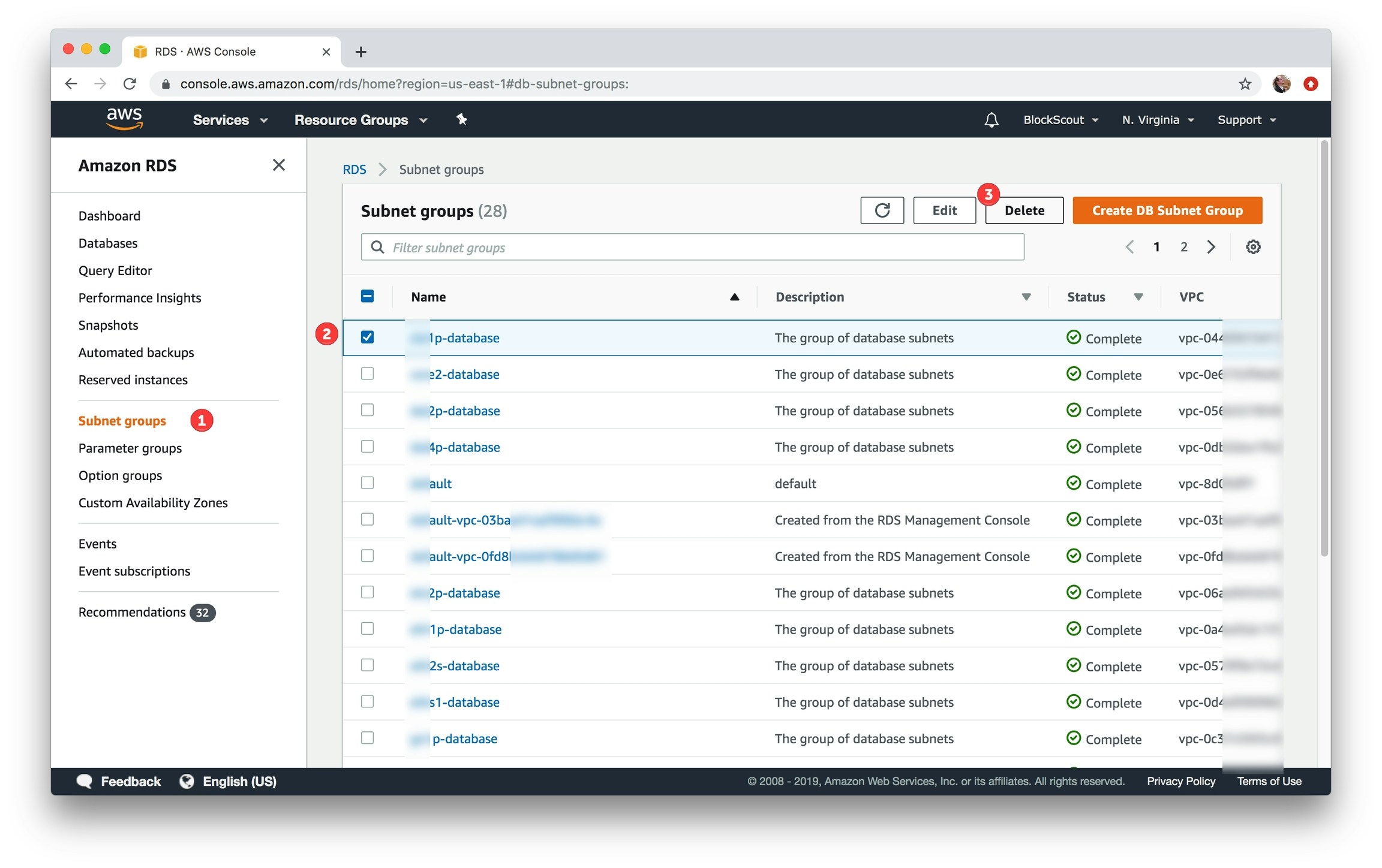 Go to Subnet Groups, select the subnet to delete, click the Delete button and confirm
