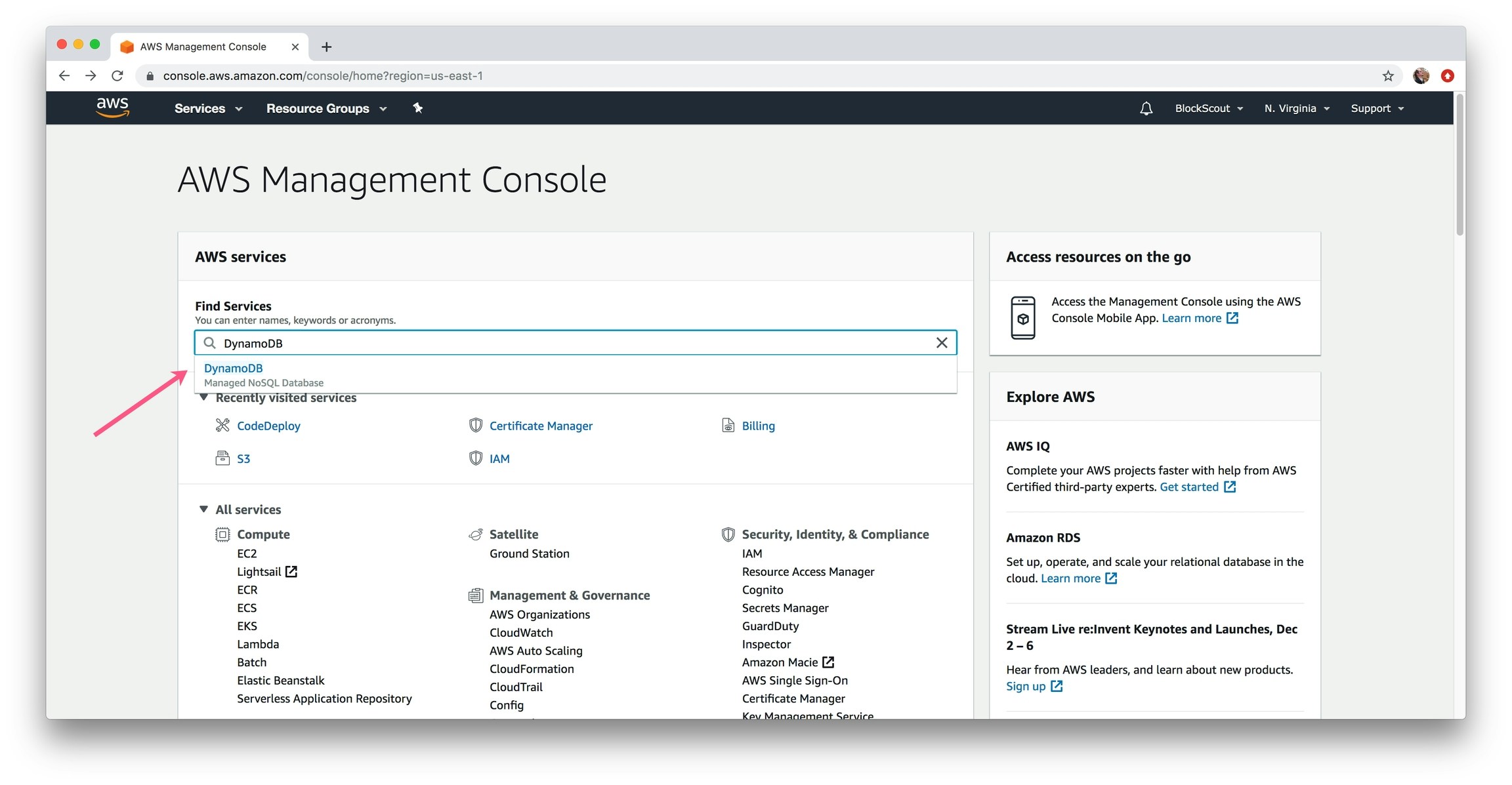 1) In the Find Services box, type in DynamoDB and select.