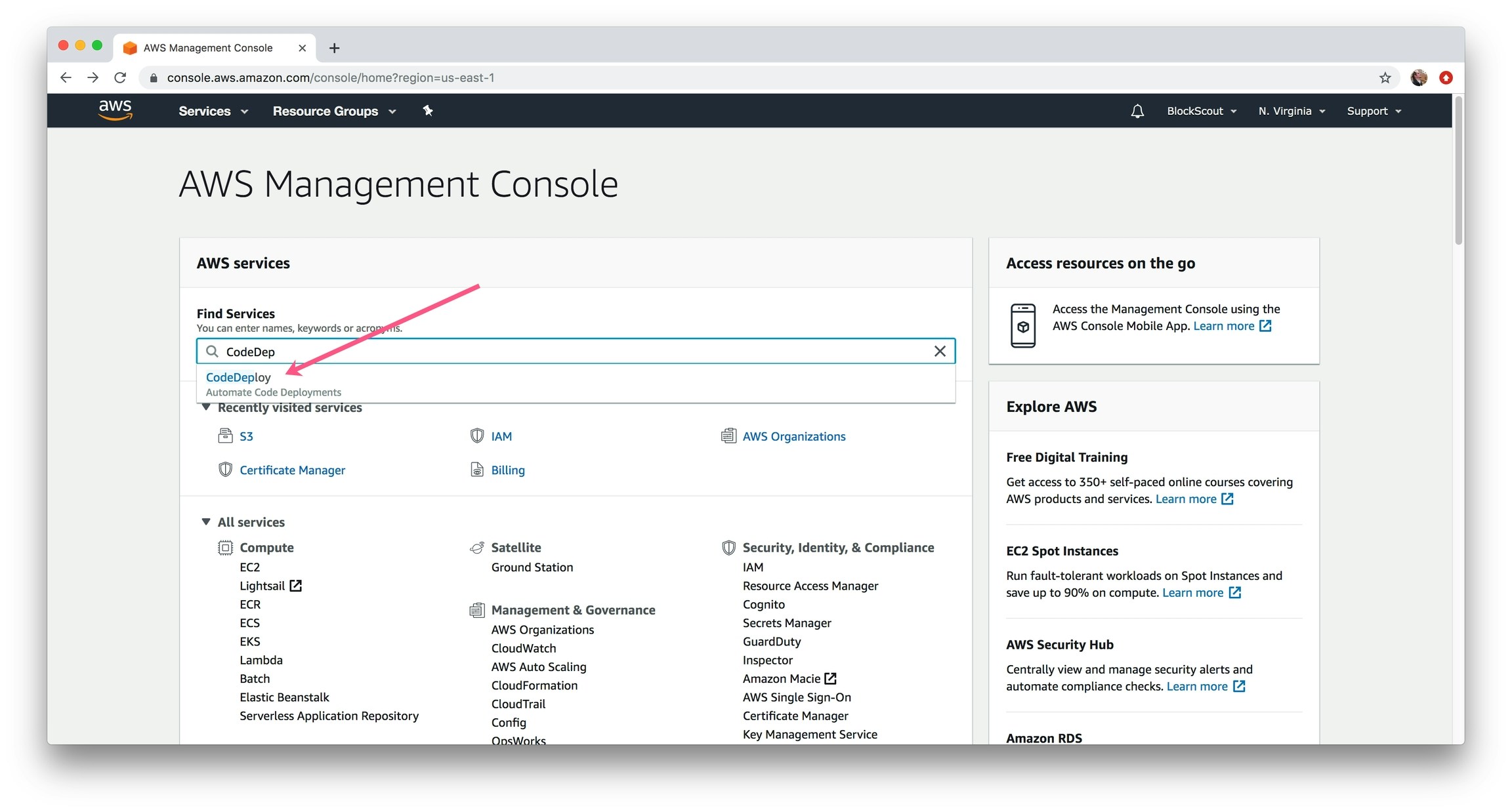 1) In the Find Services box, type in CodeDeploy and select.