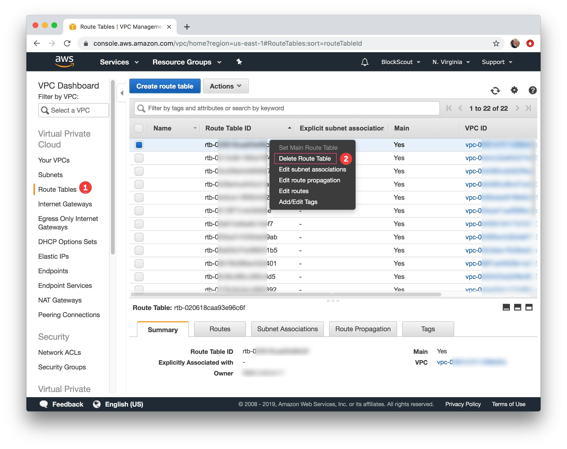 Select route table to delete, right click, select Delete Route Table and confirm deletion.