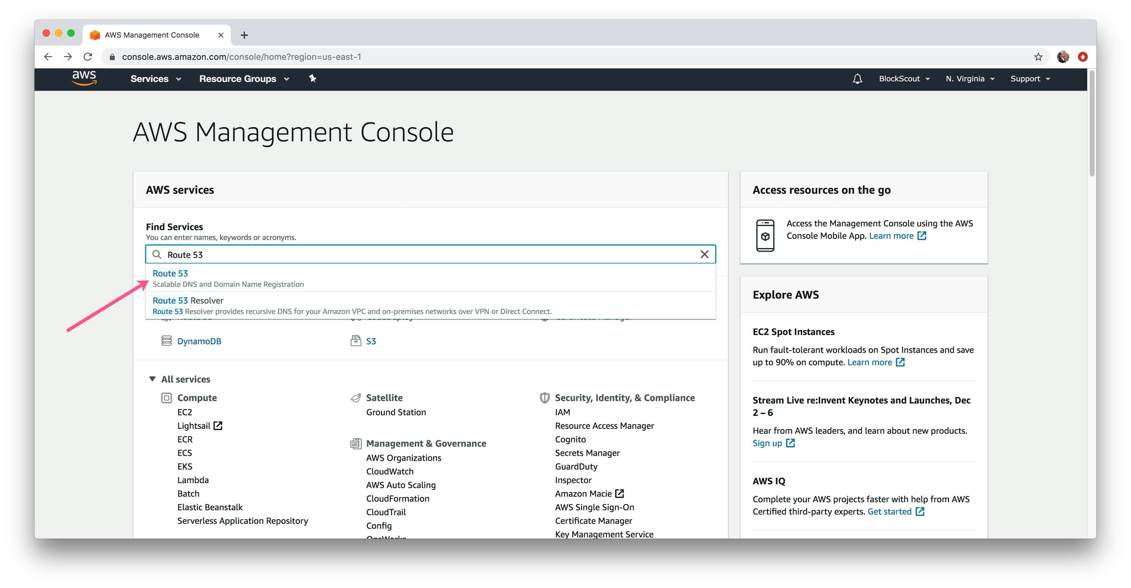 1) In the Find Services box, type in Route 53 and select.