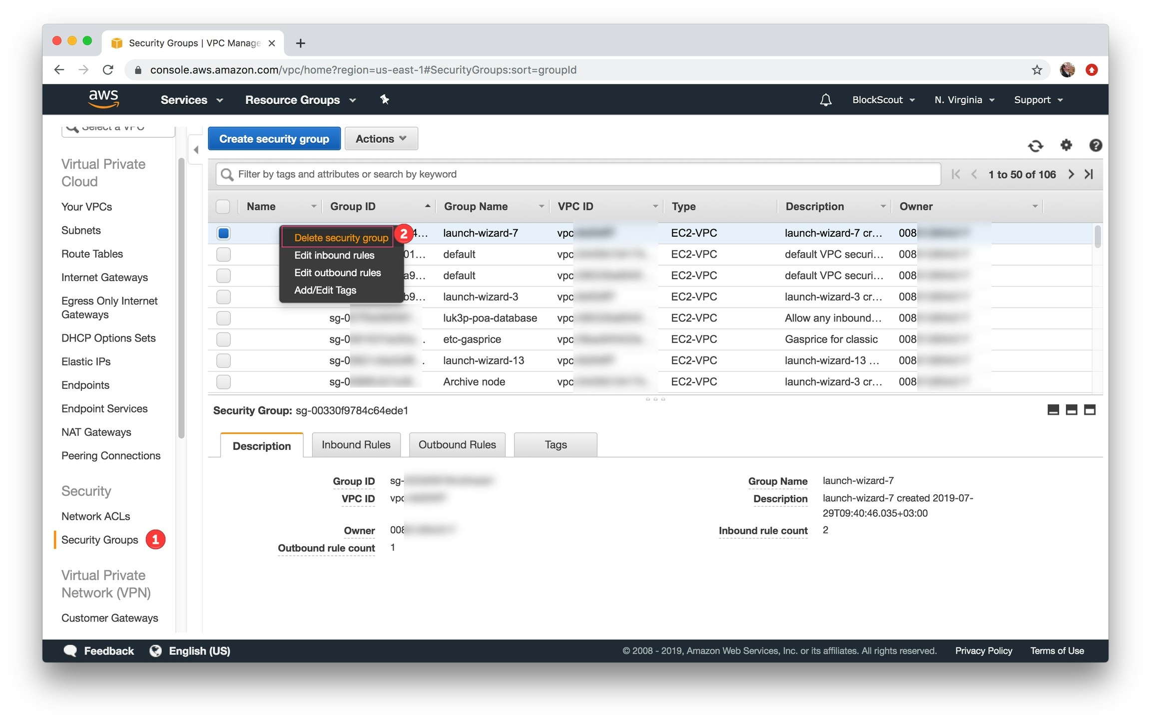 Go to Security Groups, select security group, right click, select Delete security group, confirm