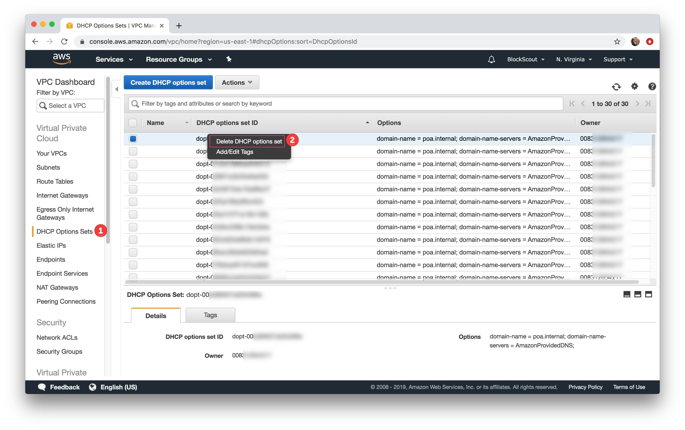 Select DHCP Option Sets, select set, right click, select Delete DHCP options set and confirm